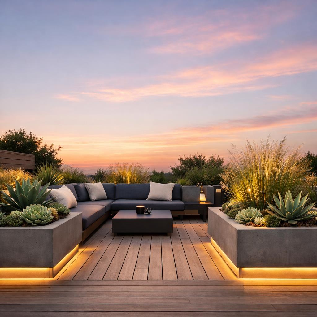 Ein moderner Stadtgarten nutzt den begrenzten Raum optimal. Klare Linien und reduzierte Bepflanzung dominieren. Hochbeete und Pflanzkübel schaffen Struktur. Ein kleiner Lounge-Bereich mit wetterfesten Möbeln lädt zum Verweilen ein. Die Beleuchtung setzt gezielte Akzente, die den Garten auch abends attraktiv machen.